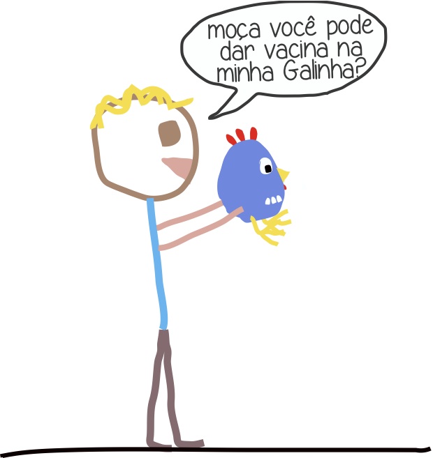 A simpática moça pegou uma nova seringa, abriu, fingiu que deu vacina no bumbum da galinha, e colou um band aid redondinho no local.
