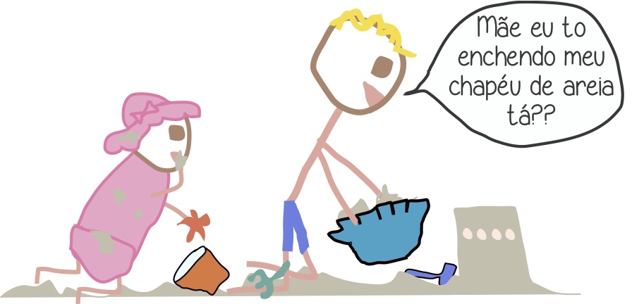 Bom, mas em vez de fazer no mar disfarçadamente como toda criança, meu filho sai da água, abaixa a sunga e vai correndo atéééé a entrada da praia, onde tem um gramado.