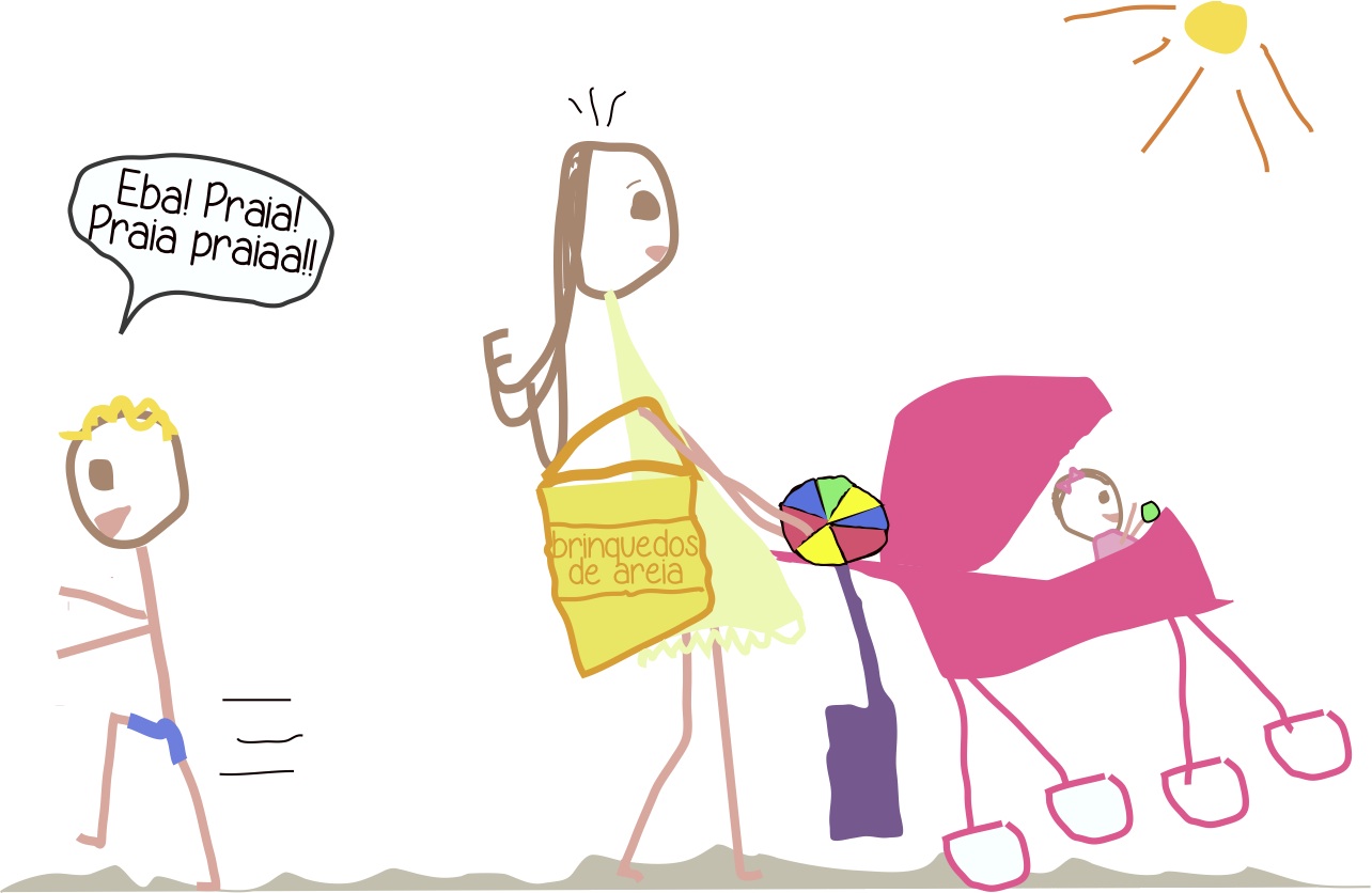 Cantando, correndo e carregados até a alma (com o carrinho, os brinquedos de areia, a bola, a bolsa de praia tamanho família – com trocas de roupa, fraldas, lenços umedecidos, comidas e mantimentos, livro, protetor infantil, protetor de adulto, toalhas, tapetinho, água, celular, máquina fotográfica, chupeta, chupeta extra, dinheiro…) chegamos na praia parecendo um camelô.