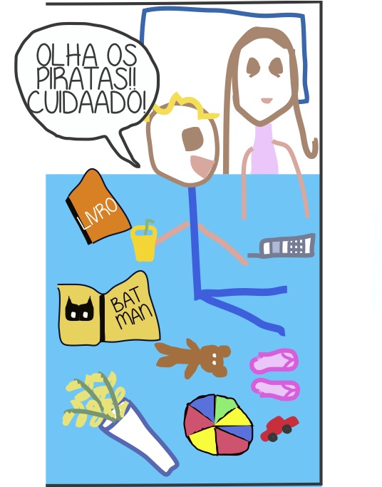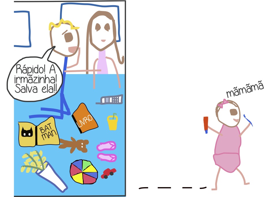 Não posso deixar minha filha se afogando no mar né? Acabo pegando-a e acomodando-a em nossa embarcação.
