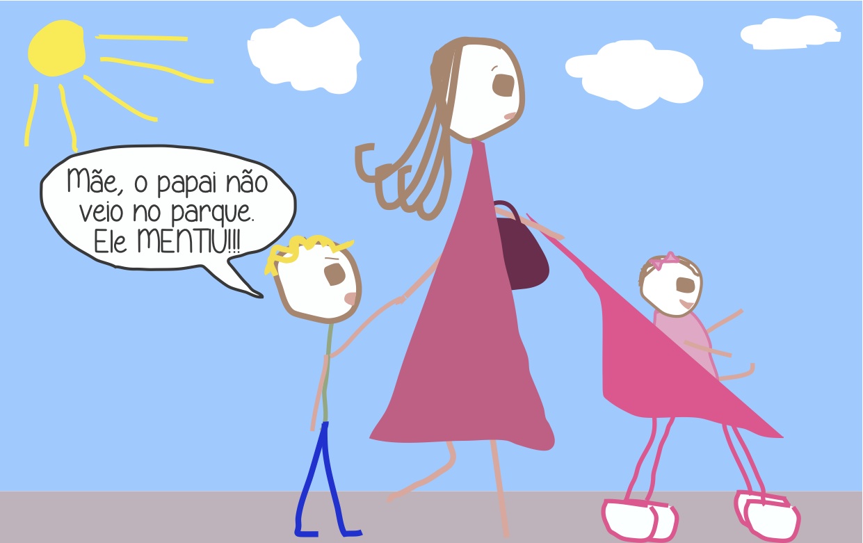 EU (pacientemente): Filho, ele não mentiu, deve ser que ele ficou ocupado com as coisas de trabalho e não conseguiu vir. Agora a gente fala com ele em casa.
