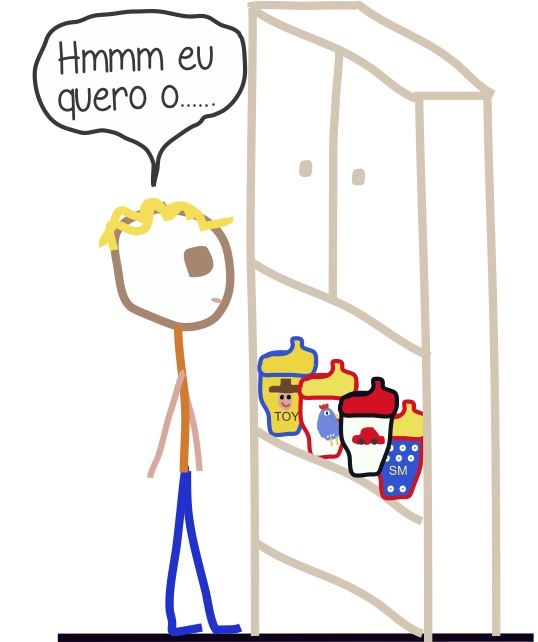 Como ele não toma uma decisão, resolvo ajudar e tenho a péssima ideia de sugerir o copo do Toy Story.