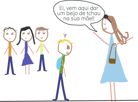 Na frente de TODOS OS AMIGOS!! Alguns riem, outros fazem cara de estarem achando graça. O menino, é claro, fica vermelho de vergonha e lança à mãe um olhar de súplica, como quem diz: “mãe!!! Para!!!”