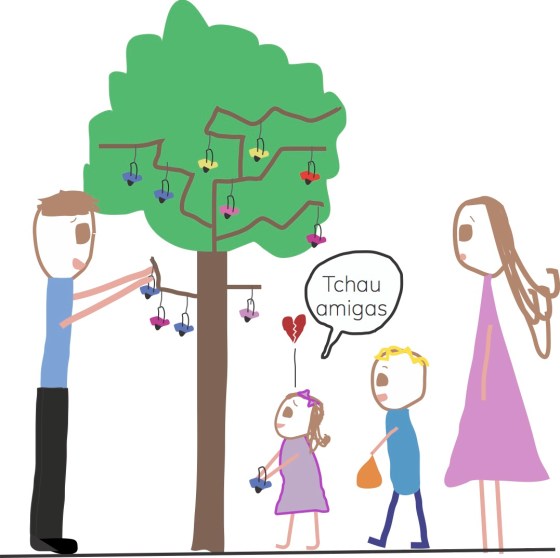 Bom, minha segunda filha decidiu que gostaria de dar suas chupetas aos pássaros. Há uma linda árvore aqui no meu bairro que foi apelidada de Árvore das Chupetas, e quando chegam à idade certa, crianças de todas as ruas vêm e amarram suas chupetas nos galhos, despedindo-se delas com água nos olhos, dor no coração e uma coragem que eu nunca vi.