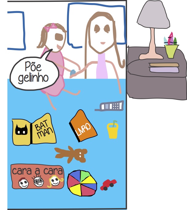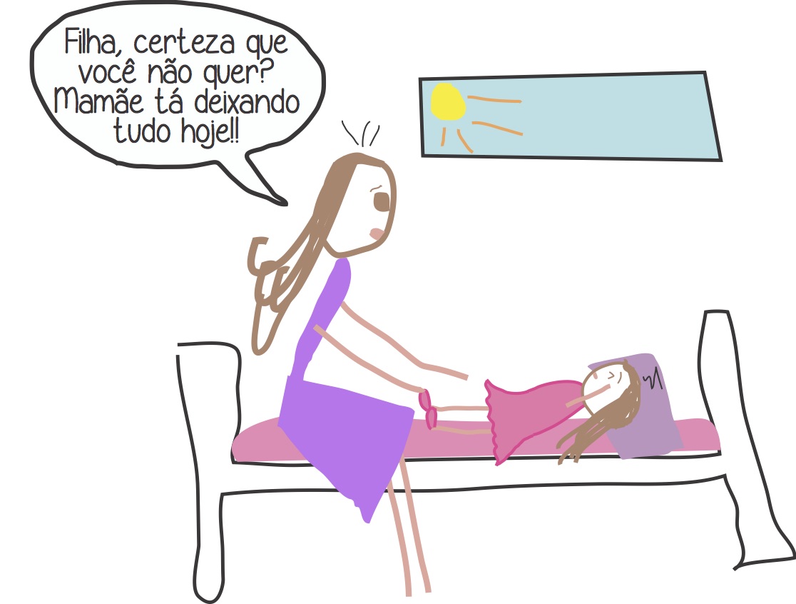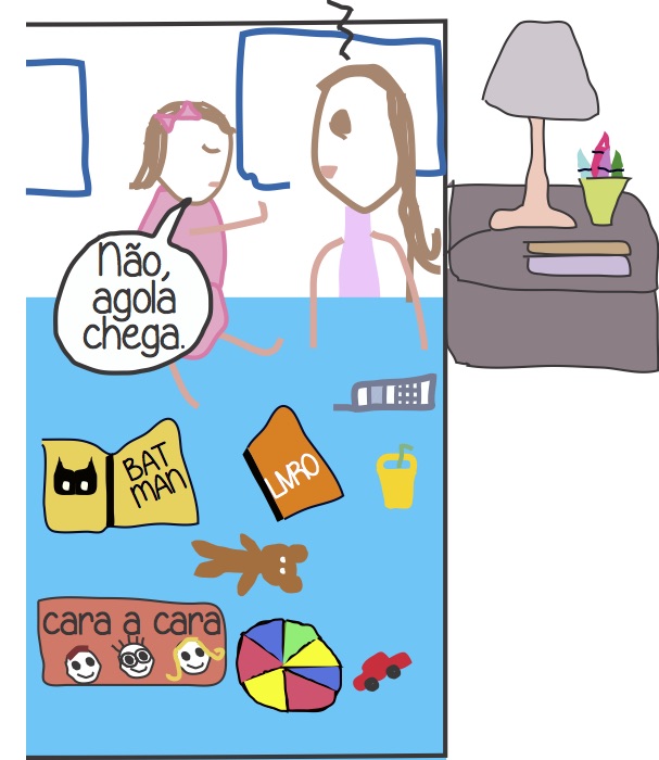 Eu, já mais esperta, responsável e experiente, vou ao hospital com um pedido de exame em mãos, para não pegar a monstruosa fila como da outra vez. Mesmo assim, todo o processo leva um tempo, onde brincamos e desenhamos com aqueles brinquedos e giz de cera contaminados da sala de espera do hospital.