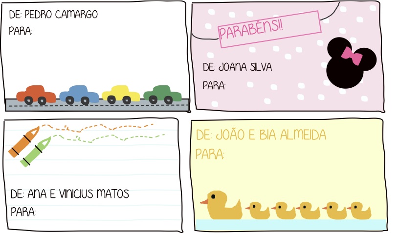 2) kit cartões: 40 cartões (com envelope e selinho) + 40 etiquetas “de/para” com o nome do seu filho (pra colocar nos presentinhos para os amigos!)