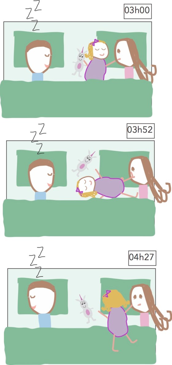 Dessa vez eu estava preparada… Despertei, determinada. Peguei ela no colo e a levei para sua própria cama. Fiquei ali um pouco, um zumbi total, e quando senti que dava para dar aquela fugida ninja do quarto, voltei pra minha cama. Deu certo!