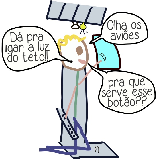 Em pouco tempo ele já descobriu a luzinha de leitura, o ar condicionado regulável, a janela que abre e fecha, e a mesa que desce e sobe.
